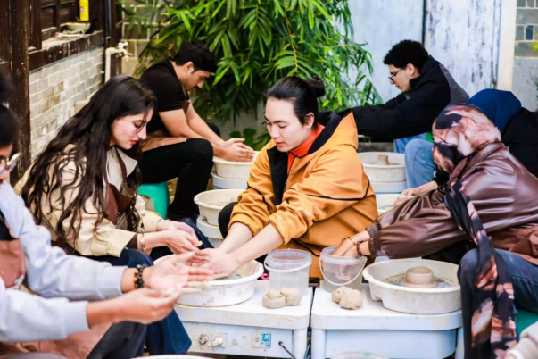在陶艺手作体验环节,来自不同国家与地区的学生围坐一室,揉泥、拉坯、塑形,指尖流淌着共同的创作热情。泥土在转盘上缓缓成型,犹如文化交流在互动中自然生长。有香港籍中医学专业学生陈飞洋分享道,中医强调“形神合一”,制陶讲究“心手相应”,两者都贯穿着东方文化中追求和谐、注重创造的生命观。